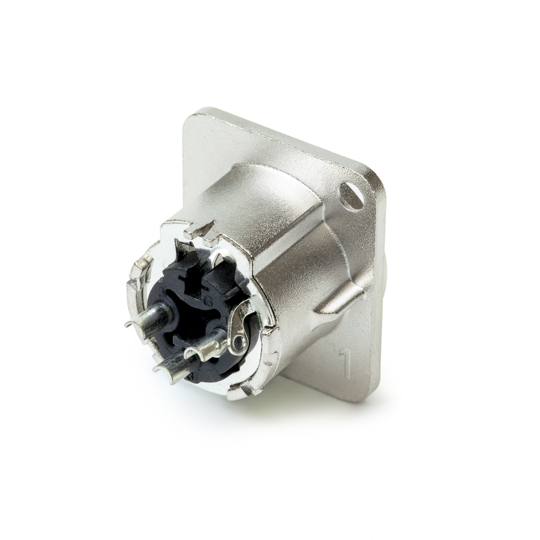 Панельный разъем XLR, 3-х контактный <штекер/папа>, А-серия, фланец D-типа, металлический никелированный корпус, контакты - покрытие серебро, под пайку