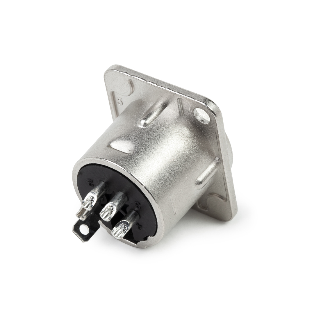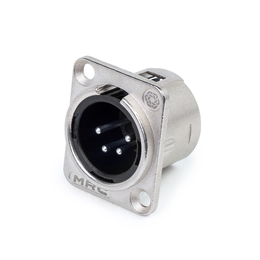 Панельный разъем XLR, 4-х контактный <штекер/папа>, DL-серия, фланец D-типа, металлический никелированный корпус, контакты - покрытие серебро, под пайку