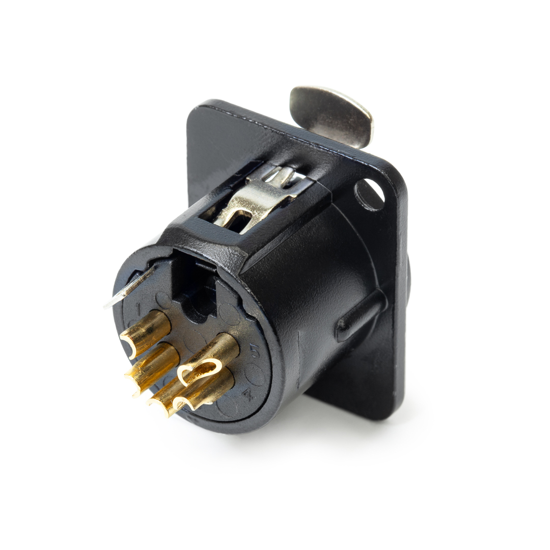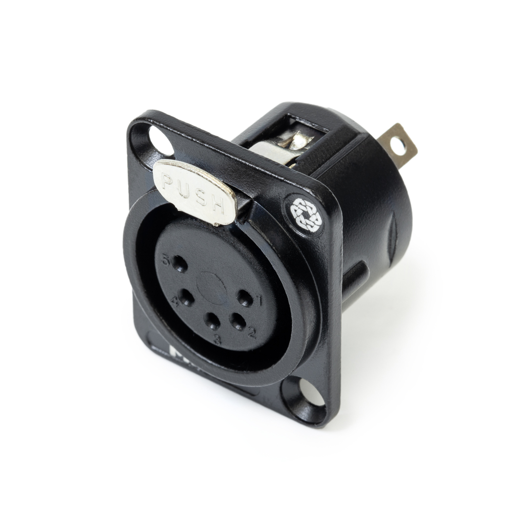 Панельный разъем XLR, 5-и контактный <гнездо/мама>, DL-серия, фланец D-типа, черный металлический корпус, контакты - покрытие золото, под пайку