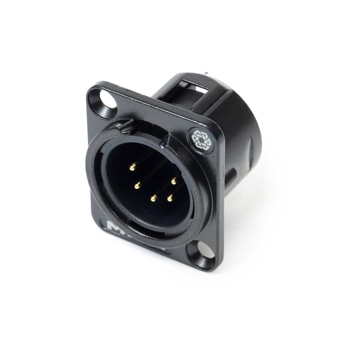Панельный разъем XLR, 5-и контактный <штекер/папа>, DL-серия, фланец D-типа, черный металлический корпус, контакты - покрытие золото, под пайку