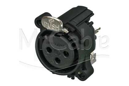 Панельный разъем XLR, 3-х контактный <гнездо/мама>, АА-серия, фланец А-типа, вертикальная установка PCB, пластиковый корпус, заземление: контакт 1 - на массу и на корпус ответного разъема, контакты - покрытие золото, под пайку.
