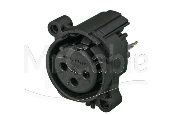 Панельный разъем XLR, 3-х контактный <гнездо/мама>, АА-серия, фланец А-типа, вертикальная установка PCB, пластиковый корпус, заземление: без заземляющего контакта, удерживающая пружина вместо защелки, контакты - покрытие золото, под пайку.