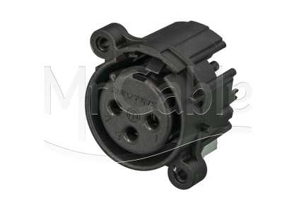 Панельный разъем XLR, 3-х контактный <гнездо/мама>, А-серия, фланец А-типа, боковая левая установка PCB, компактный пластиковый корпус, заземление: контакт 1 - на массу и на корпус ответного разъема, удерживающая пружина вместо защелки, контакты - покрытие золото, под пайку.