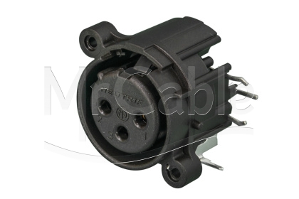 Панельный разъем XLR, 3-х контактный <гнездо/мама>, А-серия, фланец А-типа, боковая правая установка PCB, компактный пластиковый корпус, заземление: отдельный контакт заземления соединен с корпусом разъема и заземлением панели установки, удерживающая пружина вместо защелки, контакты - покрытие золото, под пайку.