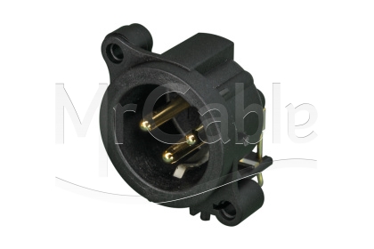 Панельный разъем XLR, 3-х контактный <штекер/папа>, АА-серия, фланец А-типа, горизонтальная установка PCB, корпус из термопластика, заземление: контакт заземления соединен с корпусом, но не соединен с контактом 1 и заземлением панели установки, контакты - покрытие золото, под пайку.