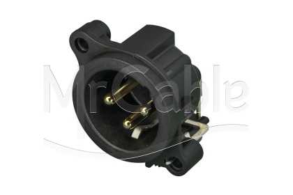 Панельный разъем XLR, 3-х контактный <штекер/папа>, А-серия, фланец А-типа, горизонтальная установка PCB, компактный корпус из термопластика, заземление: контакт 1 - на массу и на корпус ответного разъема, контакты - покрытие золото, под пайку.