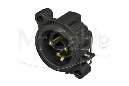 Панельный разъем XLR, 3-х контактный <штекер/папа>, А-серия, фланец А-типа, горизонтальная установка PCB, компактный корпус из термопластика, заземление: контакт заземления соединен с корпусом, но не соединен с контактом 1, контакты - покрытие золото, под пайку.
