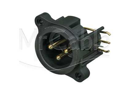 Панельный разъем XLR, 3-х контактный <штекер/папа>, А-серия, фланец А-типа, боковая правая установка PCB, корпус из термопластика, заземление: отдельный контакт заземления соединен с корпусом разъема и заземлением панели установки, контакты - покрытие золото, под пайку.