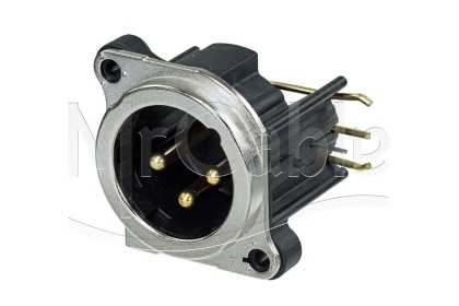 Панельный разъем XLR, 3-х контактный <штекер/папа>, B-серия, металлический фланец А-типа, дополнительная защита от RF, боковая правая установка PCB, компактный корпус из термопластика, заземление: отдельный контакт заземления соединен с корпусом разъема и заземлением панели установки, контакты - покрытие золото, под пайку.