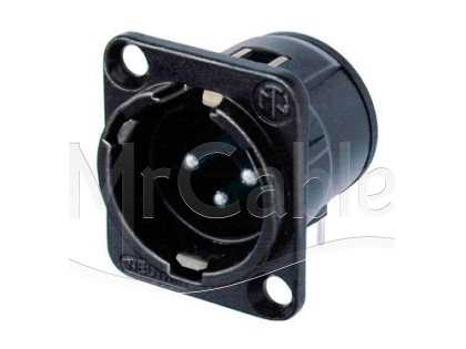 Панельный разъем XLR, 3-х контактный <штекер/папа>, D-серия, фланец D-типа, горизонтальная установка PCB, черный металлический никелированный корпус, контакты - покрытие серебро, под пайку.