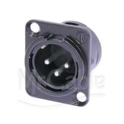 Панельный разъем XLR, 3-х контактный <штекер/папа>, DL-серия, фланец D-типа, черный металлический никелированный корпус, контакты - покрытие серебро, под пайку.