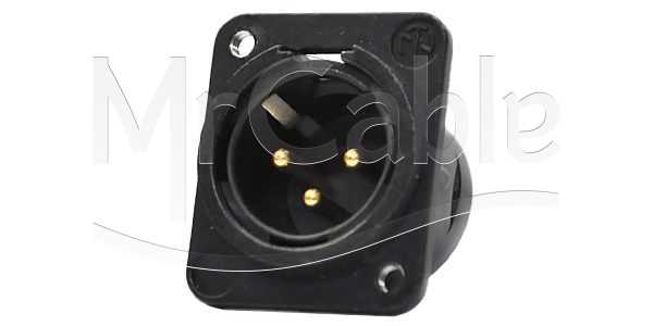 Панельный разъем XLR, 3-х контактный <штекер/папа>, DL-серия, фланец D-типа, черный хромированный металлический корпус, контакты - покрытие золото, монтажные отверстия M3, под пайку.