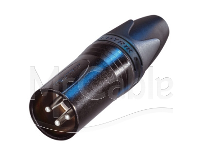 Кабельный разъем XLR, 3-х контактный <штекер/папа>, XX-серия, черный хромированный металлический корпус, контакты - покрытие серебро, под пайку, зажимной патрон, полиуретановый колпачок на кабель диаметром (3.5-8.0 мм). Логотип MrCable.
