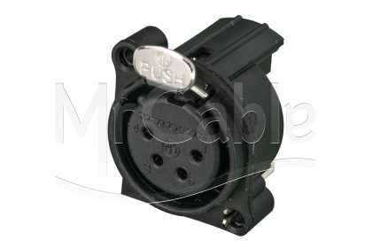 Панельный разъем XLR, 4-х контактный <гнездо/мама>, А-серия, фланец А-типа, горизонтальная установка PCB, компактный корпус из термопластика, заземление: отдельный контакт заземления - корпус разъема - корпус установки соединены, возможна цветовая маркировка, контакты - покрытие золото, под пайку.