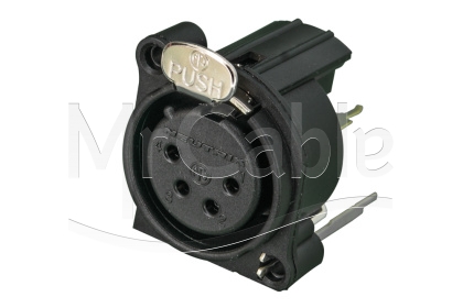 Панельный разъем XLR, 4-х контактный <гнездо/мама>, А-серия, фланец А-типа, вертикальная установка PCB, компактный корпус из термопластика, заземление: отдельный контакт заземления - корпус разъема - корпус установки соединены, возможна цветовая маркировка, контакты - покрытие золото, под пайку.