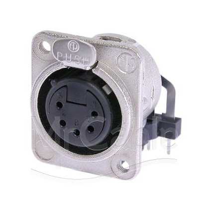 Панельный разъем XLR, 5-и контактный <гнездо/мама>, DL-серия, фланец D-типа, горизонтальная установка PCB, металлический никелированный корпус, контакты - покрытие серебро, монтажные отверстия M3, под пайку.