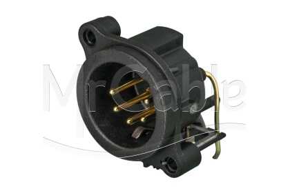 Панельный разъем XLR, 5-и контактный <штекер/папа>, А-серия, фланец А-типа, горизонтальная установка PCB, компактный корпус из термопластика, заземление: отдельный контакт заземления - корпус разъема - корпус установки соединены, контакты - покрытие золото, под пайку.