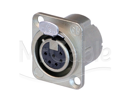 Панельный разъем XLR, 6-и контактный <гнездо/мама>, DLX-серия, фланец D-типа, компактный металлический никелированный корпус с двойным заземляющим контактом, обеспечивающий отличную защиту от RF, контакты - покрытие серебро, под пайку.