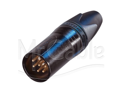 Кабельный разъем XLR, 6-и контактный <штекер/папа>, XX-серия, черный хромированный металлический корпус, контакты - покрытие золото, под пайку, зажимной патрон, полиуретановый колпачок на кабель диаметром (3.5-8.0 мм).