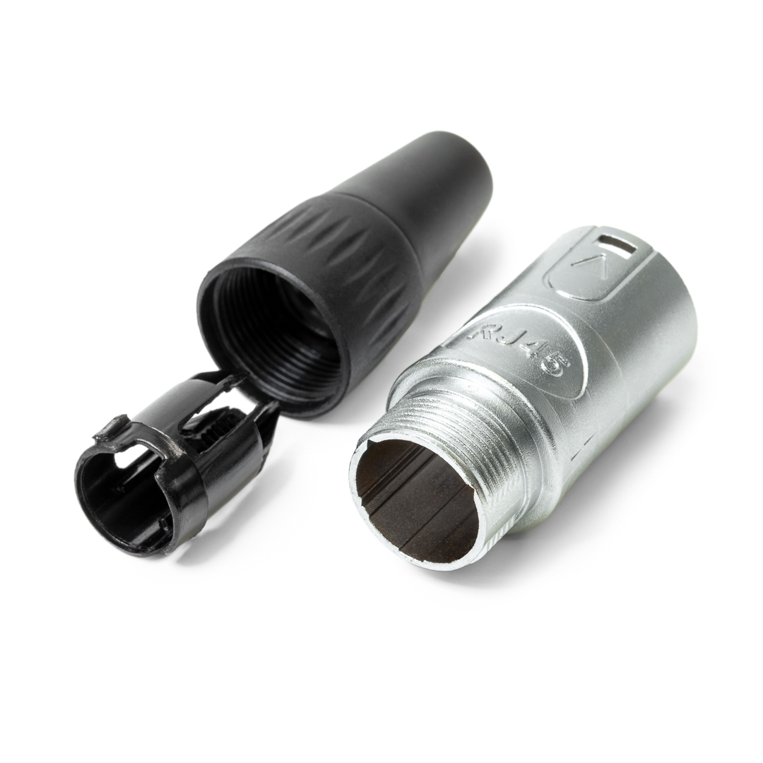 Кабельный корпус разъема XLR для RJ45, EtherCON, (под стандартный модуль RJ45, в комплект не входит), хромированный металлический корпус, фиксирующий диск, зажимной патрон, полиуретановый колпачок, на кабель диаметром (3.5-8.0 мм)