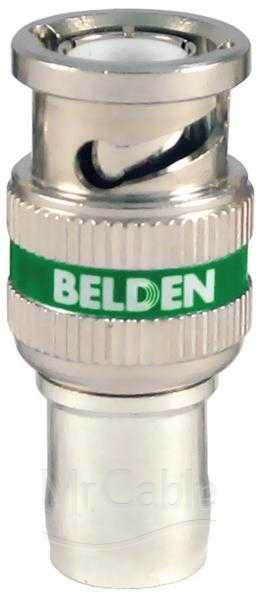 Кабельный разъем BNC для аналоговых и цифровых видеосигналов HD-SDI, <штекер/папа>, компрессионный, для кабеля Belden 1694A (серия Brilliance), зеленая маркировка, металлический никелированный корпус, центральный контакт - покрытие золото. 75 Ом. Однокомпонентная конструкция для упрощения монтажа. Компрессионный способ крепления - этот способ более надежен, чем просто обжим, обеспечит самые высокие механические и электрические характеристики. Для фиксации кабеля в разъеме используется пластиковая втулка, которая равномерно зажимает кабель по окружности. Байонетный замок разъема позволяет надежно использовать его в тракте сигналов с частотой до 4.5 гГц. Потери: 21 дБ (при 4.5 гГц).