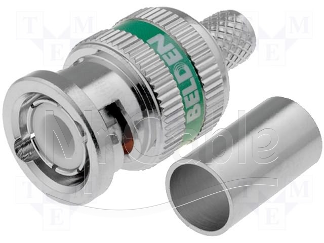 Кабельный разъем BNC для аналоговых и цифровых видеосигналов HD-SDI, <штекер/папа>, для кабеля Belden 1694A (серия Brilliance), зеленая маркировка, металлический никелированный корпус, центральный контакт - покрытие золото, под обжим, 75 Ом. 3-х компонентная конструкция. Разработанный специально для допусков на кабель Belden для лучшей производительности и долговечности. Байонетный замок разъема позволяет надежно использовать его в тракте сигналов с частотой до 4.5 гГц. Потери: 23 дБ (при 4.5 гГц).