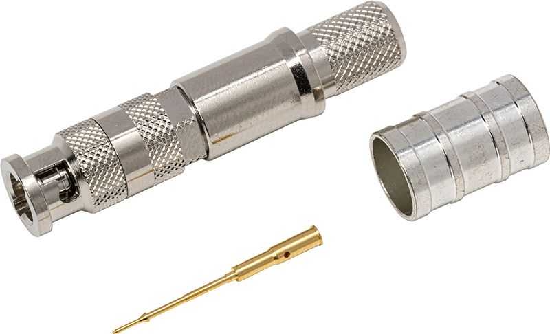 Кабельный разъем Micro-BNC для аналоговых и цифровых видеосигналов HD-SDI, серия HBCP, <штекер/папа>, металлический никелированный корпус, центральный контакт - покрытие золото, под обжим, 75 Ом. Частота до 12.0 гГц. Подходит для кабелей: Canare L-4.5CHD, L-4.5CHD-PL
