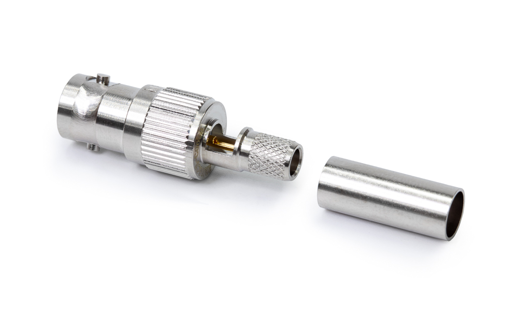 Кабельный разъем BNC для аналоговых и цифровых видеосигналов 12G-SDI 4K UHD 75 Ом, <гнездо/мама>, металлический никелированный корпус, диэлектрик (PTFE), центральный контакт - покрытие золото, под обжим, 75 Ом. КСВ не более 1.1, частота до 1.5 гГц; КСВ не более 1.2, частота до 2.4 гГц. Подходит для кабелей: Canare LV-61S, Belden 8241, CommScope 5563, Nokia 06/37, RG59B/U, Draka 06/37, Sommer 600-0051 (M,L,S), 600-0054 (M,L,S), Cordial CVI (CVM) 06-37