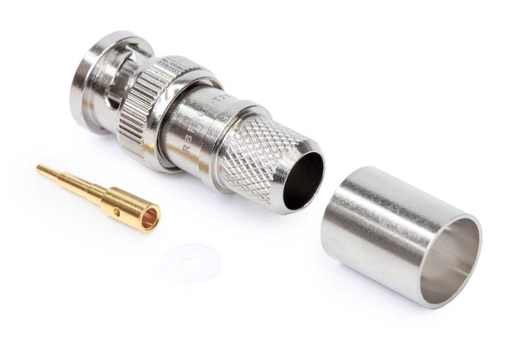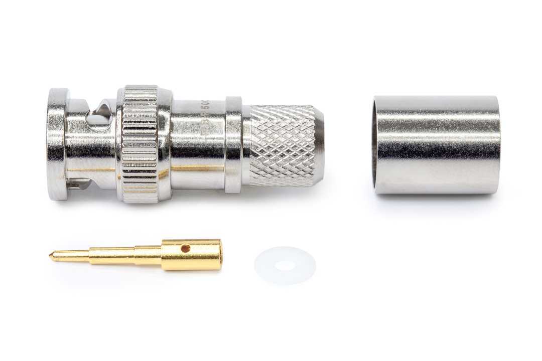 Кабельный разъем BNC 50 Ом, серия T, <штекер/папа>, никелированный корпус из бронзы, центральный контакт - покрытие золото, под обжим, 50 Ом. Подходит для кабелей: RG213C/U, RG8/U