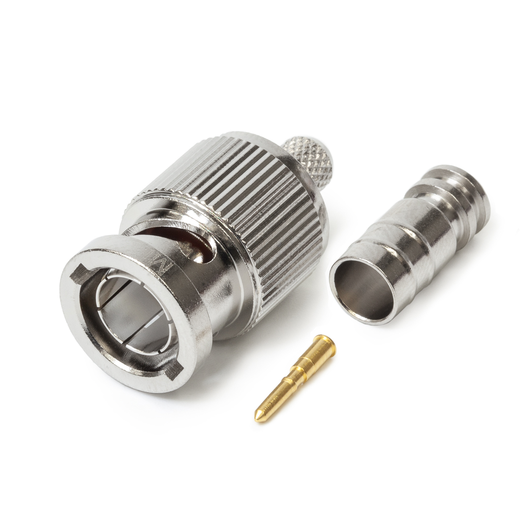 Кабельный разъем BNC 75 Ом для аналоговых и цифровых видеосигналов HD-SDI, серия B, <штекер/папа>, никелированный корпус из бронзы, центральный контакт - покрытие золото, под обжим. КСВ не более 1.1, частота до 3.0 гГц. (альтернатива Canare BCP-B25HD). Подходит для кабелей: Canare L-2.5CHD. Полностью совместим с обжимным инструментом Canare.