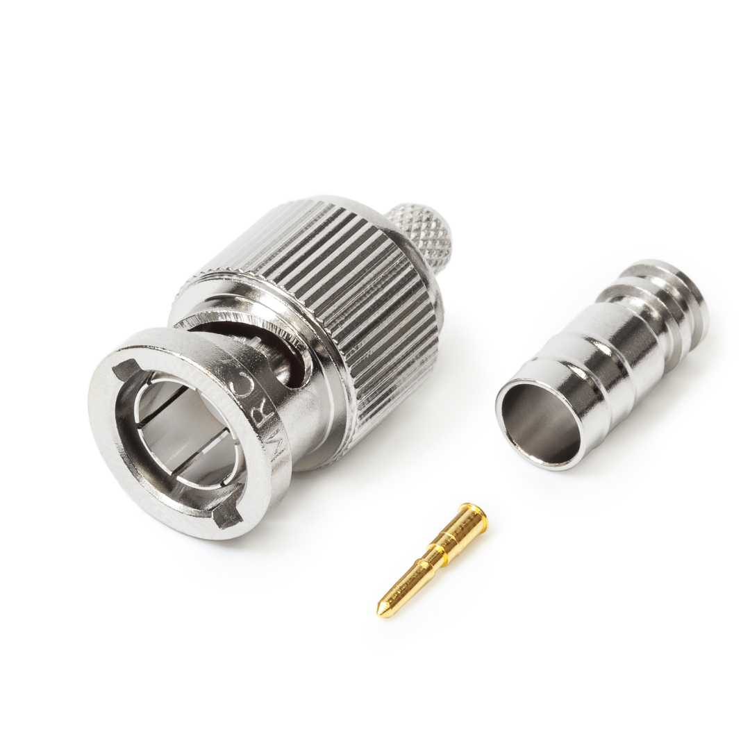 Кабельный разъем BNC для аналоговых и цифровых видеосигналов 12G-SDI 4K UHD 75 Ом, <штекер/папа>, никелированный корпус из бронзы, центральный контакт - покрытие золото, под обжим. КСВ не более 1.1, частота до 3.0 гГц. (аналог Canare BCP-B26, Canare BCP-A25F). Подходит для кабелей: Belden 1855A, Canare L-2.5CFB. Полностью совместим с обжимным инструментом Canare.