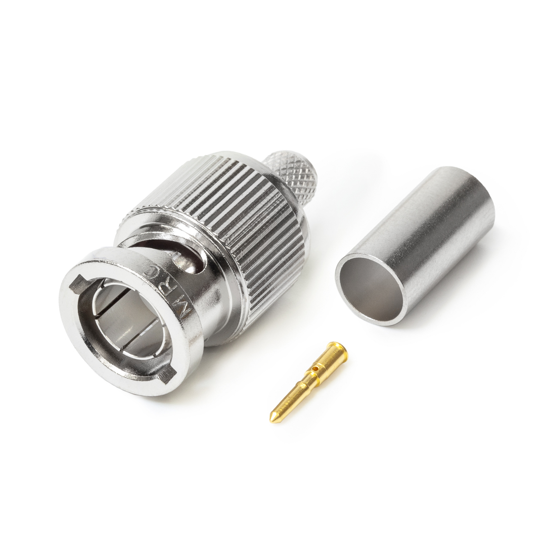 Кабельный разъем BNC для аналоговых и цифровых видеосигналов 12G-SDI 4K UHD 75 Ом, <штекер/папа>, никелированный корпус из бронзы, центральный контакт - покрытие золото, под обжим. КСВ не более 1.1, частота до 2.0 гГц. (аналог Canare BCP-A4). Подходит для кабелей: Canare LV-61S, RG59B/U, Belden 8241, 8279, CommScope 5563, Nokia 0.6/3.7, RG59B/U, Draka 0.6/3.7, Sommer 600-0051 (M,L,S), 600-0054 (M,L,S), Cordial CVI (CVM) 06-37. Полностью совместим с обжимным инструментом Canare.