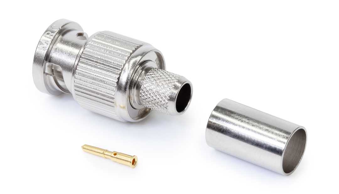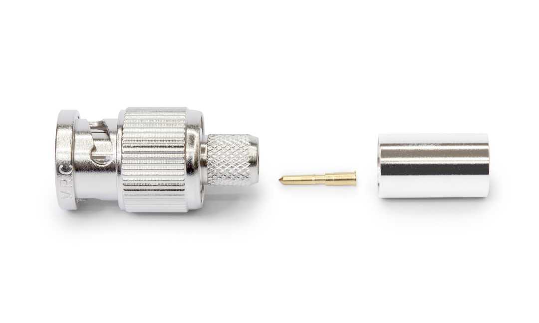 Кабельный разъем BNC для аналоговых и цифровых видеосигналов 12G-SDI 4K UHD 75 Ом, <штекер/папа>, металлический никелированный корпус, центральный контакт - покрытие золото, под обжим, 75 Ом. КСВ не более 1.1, частота до 3.0 гГц. Подходит для кабелей: Canare L-5CFB, LS-5CFB, V(3-5)-5CFB, Belden 9290,1189A. Полностью совместим с обжимным инструментом Canare.