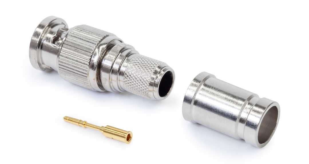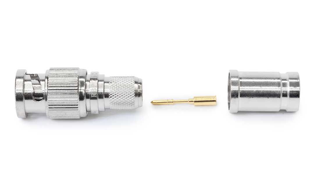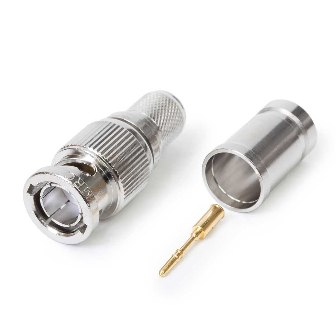 Кабельный разъем BNC для аналоговых и цифровых видеосигналов 12G-SDI 4K UHD 75 Ом, <штекер/папа>, металлический никелированный корпус, диэлектрик (PTFE), центральный контакт - покрытие золото, под обжим, 75 Ом. КСВ не более 1.1, частота до 2.0 гГц. Подходит для кабелей: Canare L-6CHD. Полностью совместим с обжимным инструментом Canare.