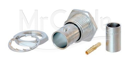 Панельный / кабельный разъем BNC, для аналоговых и цифровых видеосигналов HD-SDI, <гнездо/мама>, изолированный, крепление на панель - гайка, корпус - латунь, изолятор (PTFE), центральный контакт - покрытие золото, под обжим, на кабель диаметром (4.0-7.7 мм), 75 Ом. Структура: 1.6/7.36 мм. (пин / экран). Подходит для кабелей: Argosy Image 1000, Draka 1.0 / 4.8AF, Draka 755-901 / 5, Klotz V10 / 48.