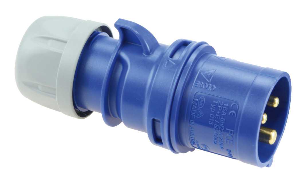 Кабельный силовой разъем СЕЕ 3-пин 16А, серия SHARK, <штекер/папа>, структура: 3-х контактный, 16А/230V/2P+E/IP44, корпус - полиамид (PA6), контакты - латунь, под винтовой зажим (винтовая клемма TWIST), класс защиты IP44, подходит для проводов сечением 1.0 - 2.5 мм2, кабельный ввод для кабеля диаметром (6.0-15.0 мм), цвет: синий