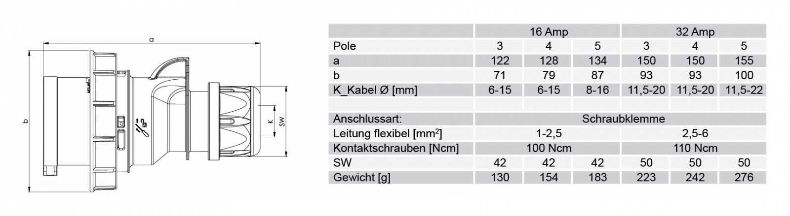 Категория Силовой Производитель PCE Категория товара Разъём Номинальный ток, А 16 Пол папа Установка кабельный Тип монтажа винтовая клемма Количество контактов 5 Диаметр совместимого кабеля, мм 8,0-16,0 Цвет корпуса красный Класс защиты IP67 Температура эксплуатации -30°C +80°C -