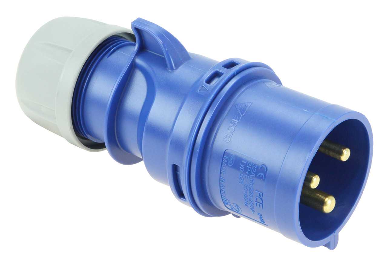 Кабельный силовой разъем СЕЕ 3-пин 32А, серия SHARK, <штекер/папа>, структура: 3-х контактный, 32А/230V/2P+E/IP44, корпус - полиамид (PA6), контакты - латунь, под винтовой зажим (винтовая клемма TWIST), класс защиты IP44, подходит для проводов сечением 2.5 - 6.0 мм2, кабельный ввод для кабеля диаметром (11.5-20.0 мм), цвет: синий