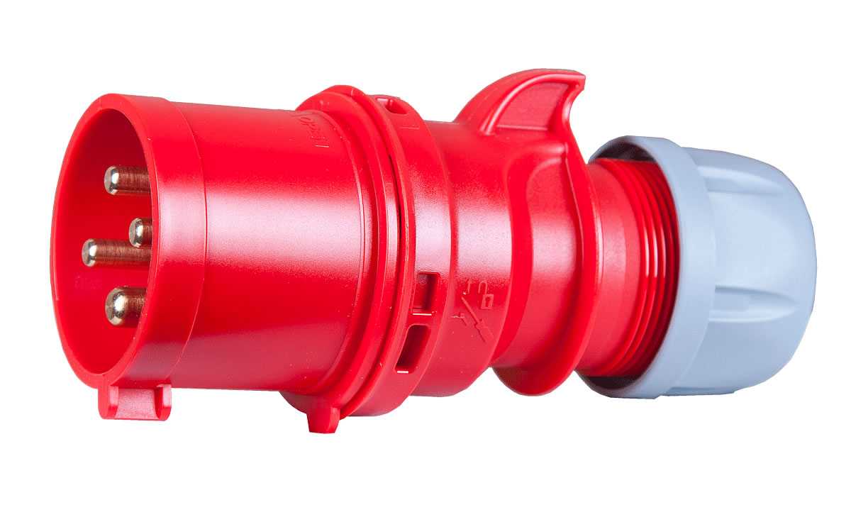 Кабельный силовой разъем СЕЕ 4-пин 32А, серия SHARK, <штекер/папа>, структура: 4-х контактный, 32А/400V/3P+E/IP44, корпус - полиамид (PA6), контакты - латунь, под винтовой зажим (винтовая клемма TWIST), класс защиты IP44, подходит для проводов сечением 2.5 - 6.0 мм2, кабельный ввод для кабеля диаметром (11.5-20.0 мм), цвет: красный