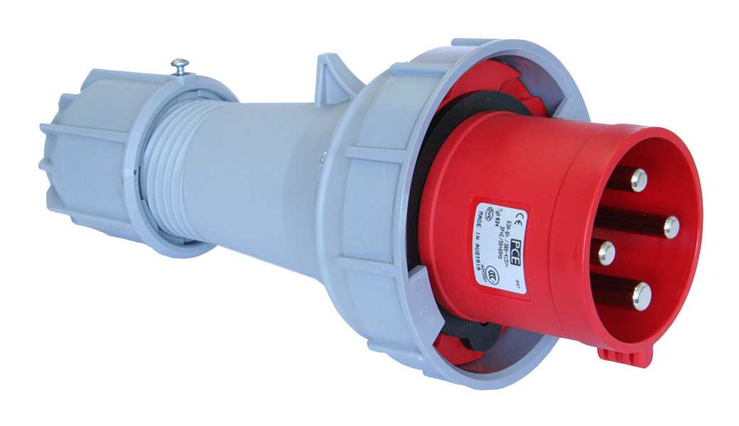 Кабельный силовой разъем СЕЕ 4-пин 63А, серия POWER TWIST, <штекер/папа>, структура: 4-х контактный, 63А/400V/3P+E/IP67, корпус - полиамид (PA6), контакты - латунь, под винтовой зажим (винтовая клемма TWIST), класс защиты IP67, подходит для проводов сечением 6.0 - 16.0 мм2, кабельный ввод для кабеля диаметром (14.5-36.0 мм), цвет: красный