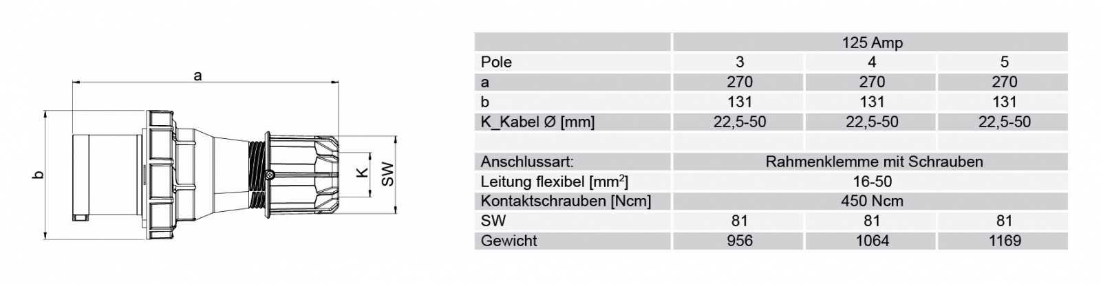 Категория Силовой Производитель PCE Категория товара Разъём Номинальный ток, А 125 Пол папа Установка кабельный Тип монтажа винтовая клемма Количество контактов 3 Диаметр совместимого кабеля, мм 22,5-50,0 Цвет корпуса синий Класс защиты IP67 Температура эксплуатации -30°C +80°C -