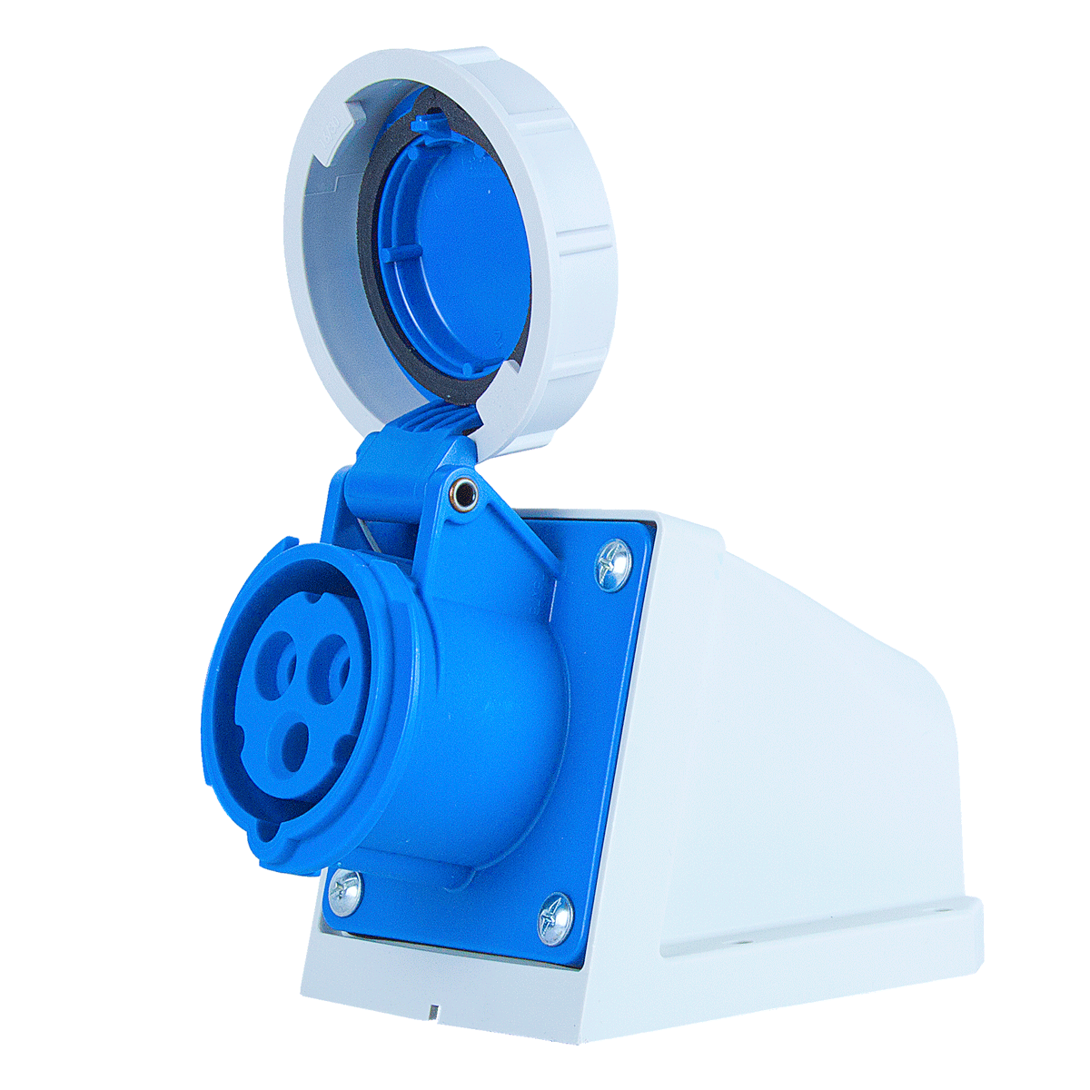 Панельный силовой разъем СЕЕ 3-пин 16А с защитной крышкой, накладной, боковой ввод, серия SHARK, <гнездо/мама>, структура: 3-х контактный, 16А/230V/2P+E/IP67, корпус - полиамид (PA6), a = 146 мм, b = 96 мм, каб. ввод M25, крепление на поверхность / наклон 15°, контакты - латунь, под винтовой зажим (винтовая клемма TWIST), класс защиты IP67, подходит для проводов сечением: витая жила (1.0 - 2.5 мм2), цельная жила (1.0 - 4.0 мм2), цвет: синий