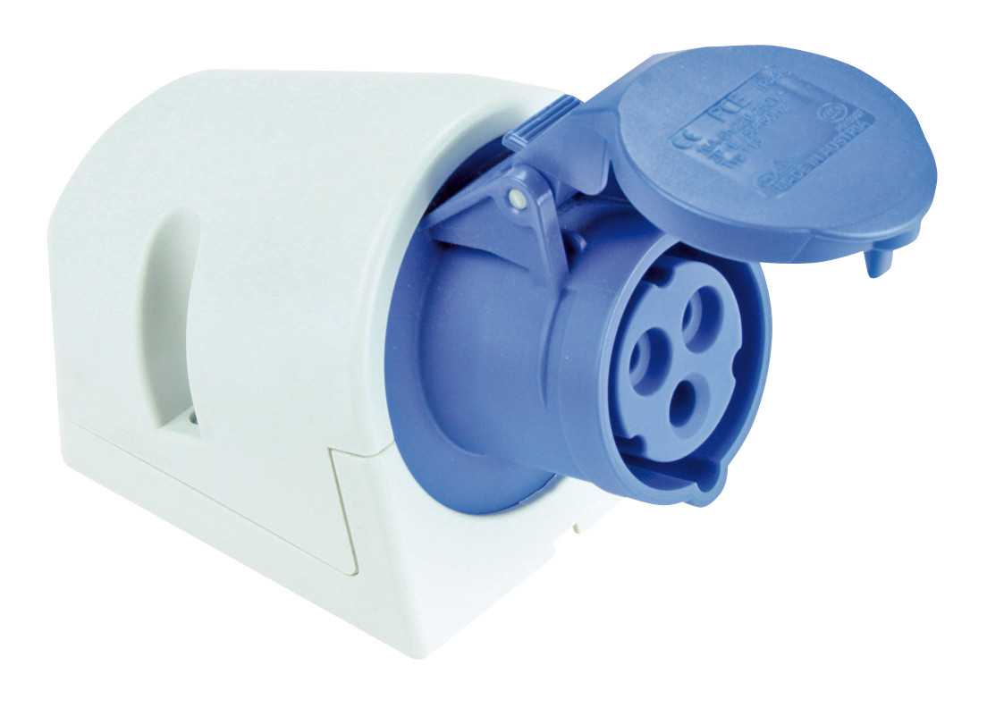Панельный силовой разъем СЕЕ 3-пин 16А с защитной крышкой, накладной, боковой ввод, серия SHARK, <гнездо/мама>, структура: 3-х контактный, 16А/230V/2P+E/IP44, корпус - полиамид (PA6), a = 142 мм, b = 97 мм, каб. ввод M25, крепление на поверхность / наклон 15°, контакты - латунь, под винтовой зажим (винтовая клемма TWIST), класс защиты IP44, подходит для проводов сечением: витая жила (1.0 - 2.5 мм2), цельная жила (1.0 - 4.0 мм2), цвет: синий