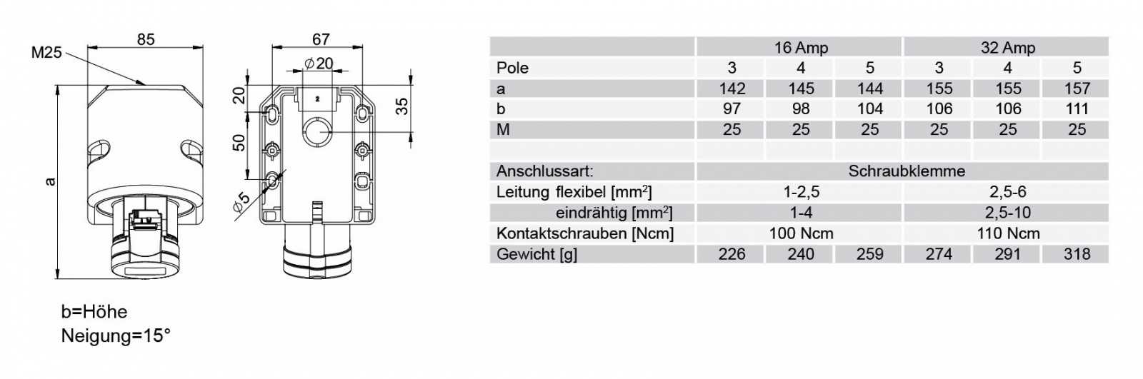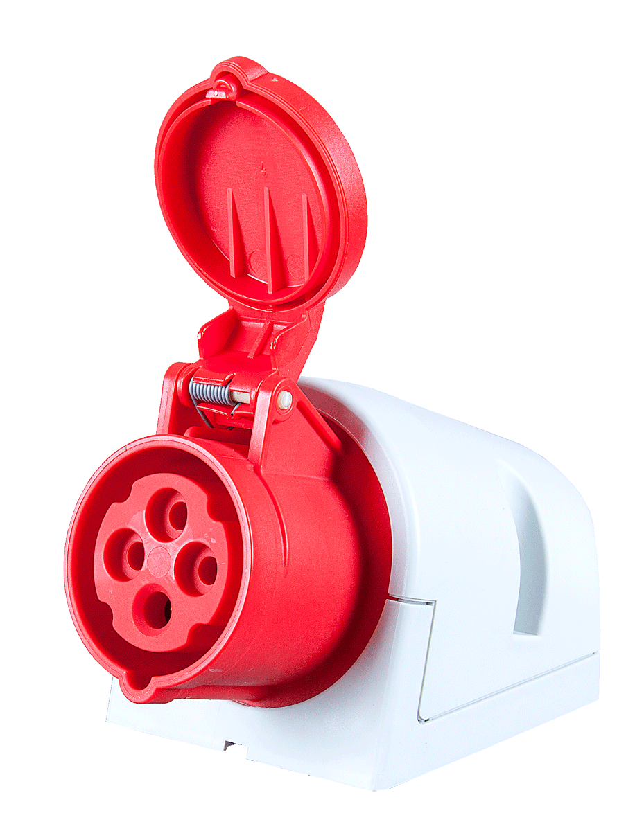 Панельный силовой разъем СЕЕ 4-пин 16А с защитной крышкой, накладной, боковой ввод, серия SHARK, <гнездо/мама>, структура: 4-х контактный, 16А/400V/3P+E/IP44, корпус - полиамид (PA6), a = 145 мм, b = 98 мм, каб. ввод M25, крепление на поверхность / наклон 15°, контакты - латунь, под винтовой зажим (винтовая клемма TWIST), класс защиты IP44, подходит для проводов сечением: витая жила (1.0 - 2.5 мм2), цельная жила (1.0 - 4.0 мм2), цвет: красный