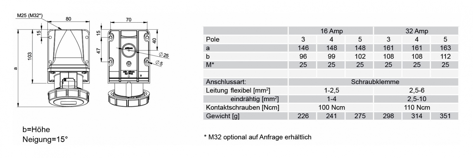 Панельный силовой разъем СЕЕ 5-пин 32А с защитной крышкой, накладной, боковой ввод, серия SHARK, <гнездо/мама>, структура: 5-и контактный, 32А/400V/3P+N+E/IP67, корпус - полиамид (PA6), a = 163 мм, b = 112 мм, каб. ввод M25, крепление на поверхность / наклон 15°, контакты - латунь, под винтовой зажим (винтовая клемма TWIST), класс защиты IP67, подходит для проводов сечением: витая жила (2.5 - 6.0 мм2), цельная жила (2.5 - 10.0 мм2), цвет: красный