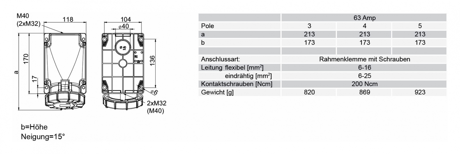 Панельный силовой разъем СЕЕ 5-пин 63А с защитной крышкой, накладной, боковой ввод, серия POWER TWIST, <гнездо/мама>, структура: 5-и контактный, 63А/400V/3P+N+E/IP67, корпус - полиамид (PA6), a = 213 мм, b = 173 мм, каб. ввод М32/40 спереди /сзади /снизу, крепление на поверхность / наклон 15°, контакты - латунь, под винтовой зажим (винтовая клемма TWIST), класс защиты IP67, подходит для проводов сечением: витая жила (6.0 - 16.0 мм2), цельная жила (6.0 - 25.0 мм2), цвет: красный