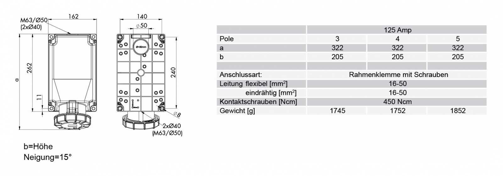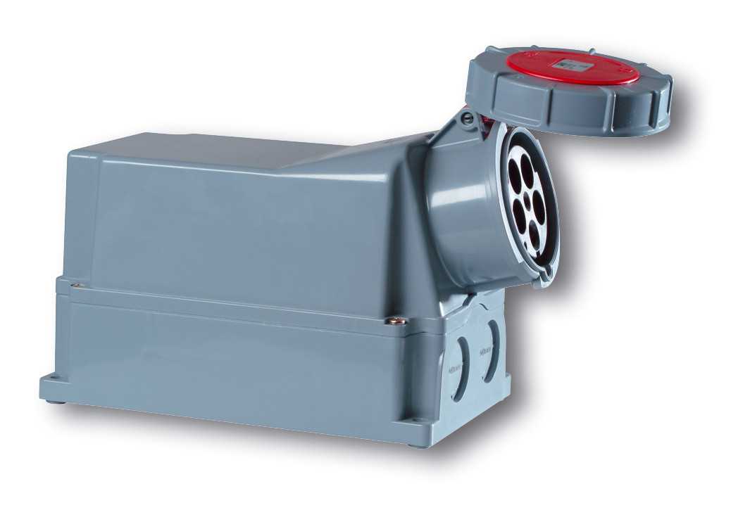 Панельный силовой разъем СЕЕ 5-пин 125А с защитной крышкой, накладной, боковой ввод, серия POWER TWIST, <гнездо/мама>, структура: 5-и контактный, 125А/400V/3P+N+E/IP67, корпус - полиамид (PA6), a = 322 мм, b = 205 мм, каб. ввод М63/Ø50 спереди /сзади /снизу, крепление на поверхность / наклон 15°, контакты - латунь, под винтовой зажим (винтовая клемма TWIST), класс защиты IP67, подходит для проводов сечением: витая жила (16.0 - 50.0 мм2), цельная жила (16.0 - 50.0 мм2), цвет: красный