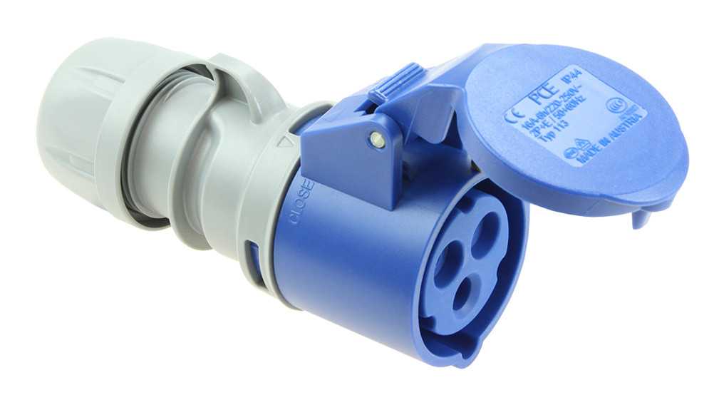 Кабельный силовой разъем СЕЕ 3-пин 16А с защитной крышкой, серия SHARK TT, <гнездо/мама>, структура: 3-х контактный, 16А/230V/2P+E/IP44, корпус - полиамид (PA6), контакты - латунь, безвинтовой зажим (безвинтовая клемма TURBO TWIST), класс защиты IP44, подходит для проводов сечением 1.0 - 2.5 мм2, кабельный ввод для кабеля диаметром (6.0-15.0 мм), цвет: синий