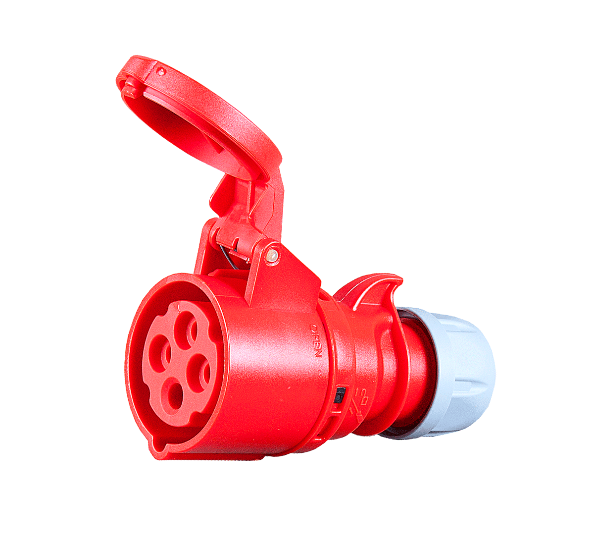 Кабельный силовой разъем СЕЕ 4-пин 16А с защитной крышкой, серия SHARK, <гнездо/мама>, структура: 4-х контактный, 16А/400V/3P+E/IP44, корпус - полиамид (PA6), контакты - латунь, под винтовой зажим (винтовая клемма TWIST), класс защиты IP44, подходит для проводов сечением 1.0 - 2.5 мм2, кабельный ввод для кабеля диаметром (6.0-15.0 мм), цвет: красный