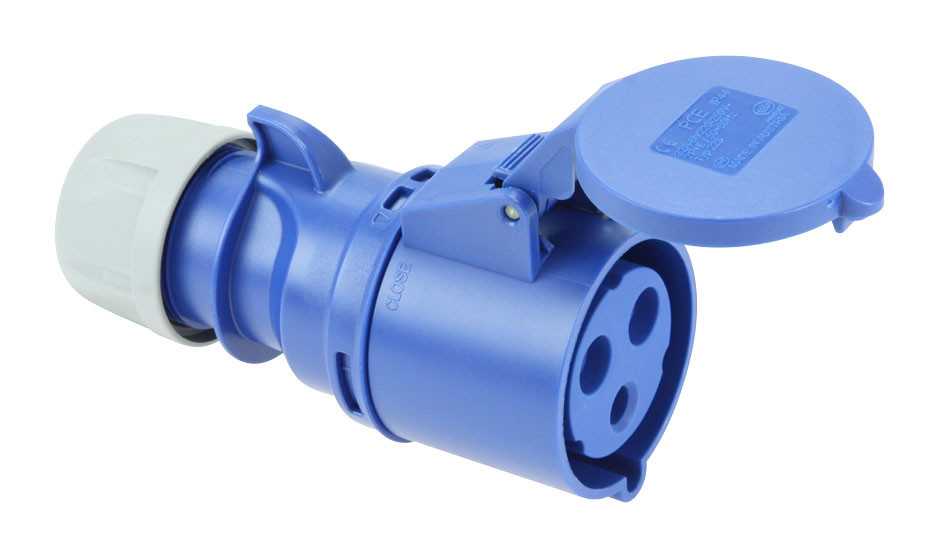 Кабельный силовой разъем СЕЕ 3-пин 32А с защитной крышкой, серия SHARK, <гнездо/мама>, структура: 3-х контактный, 32А/230V/2P+E/IP44, корпус - полиамид (PA6), контакты - латунь, под винтовой зажим (винтовая клемма TWIST), класс защиты IP44, подходит для проводов сечением 2.5 - 6.0 мм2, кабельный ввод для кабеля диаметром (11.5-20.0 мм), цвет: синий